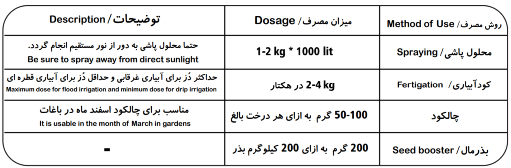 برای مصرف صحیح و متناسب با شرایط خاک و گیاه، توصیه میشود پیش از استفاده با کارشناس تغذیه گیاه یا گیاهپزشک مشورت نمایید. تیم مشاوره ما آماده ارائه خدمات تخصصی برای مزرعه یا باغ شماست.